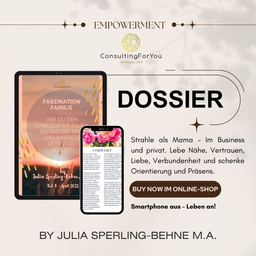 Ein Kind verändert alles – den privaten Alltag, das Arbeitsleben, die Perspektiven und oft auch einen selbst. “Faszination Familie” ist ein kompakter, praxisnaher Leitfaden für alle Eltern und Interessierten, die die Lebensphase mit Kind, Familie und Business gesund, kraftvoll und voller Energie meistern möchten. Die Anwendung der Inhalte des E-Book Dossiers “Faszination Familie” ermöglicht Kindern und Erwachsenen eine Herangehensweise, die Business und Privatleben vereinbar macht.